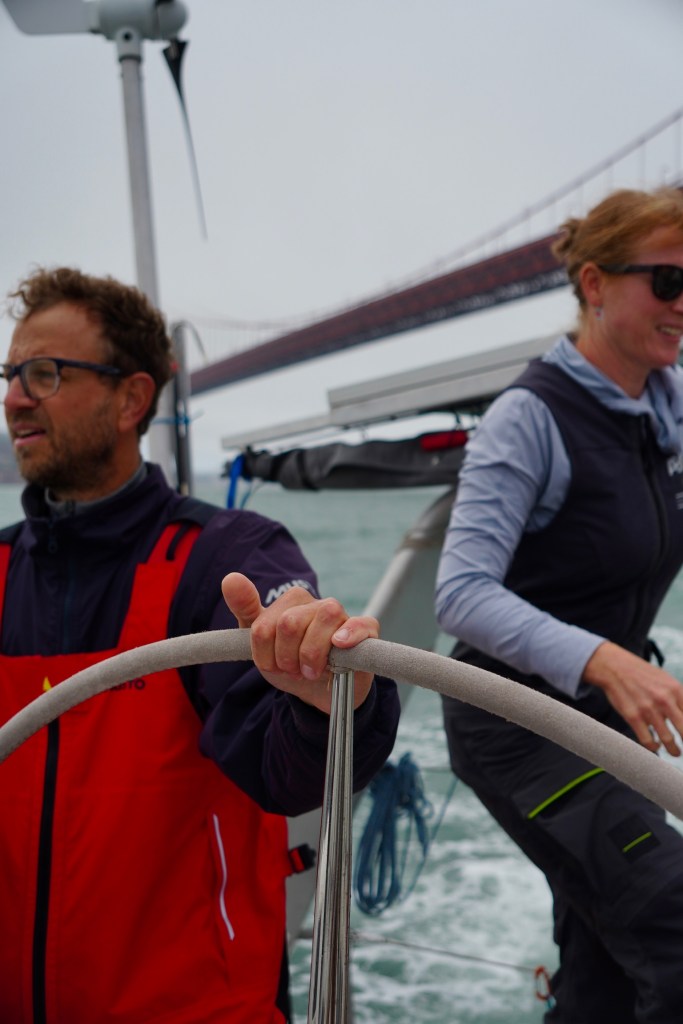 As we rounded up north past the Golden Gate Bridge the breeze built from 15 knots quickly to around 25. We set about making Flyer ship-shape for arrival, furling our sails, coiling our lines, and preparing fenders and dock lines. When we were around a mile from the Sausalito ferry dock the breeze spiked to 40. The mainsail was down by this point, engine was on, and Flyer was pushing her way north through it all. The SuperWind generator – our wind turbine that generates electricity for the boat mounted just behind the helm – was spinning so fast it would ‘speed wobble’ with an awful roaring sound as the gusts reached 50 knots. It was quickly evolving into a memorable arrival.