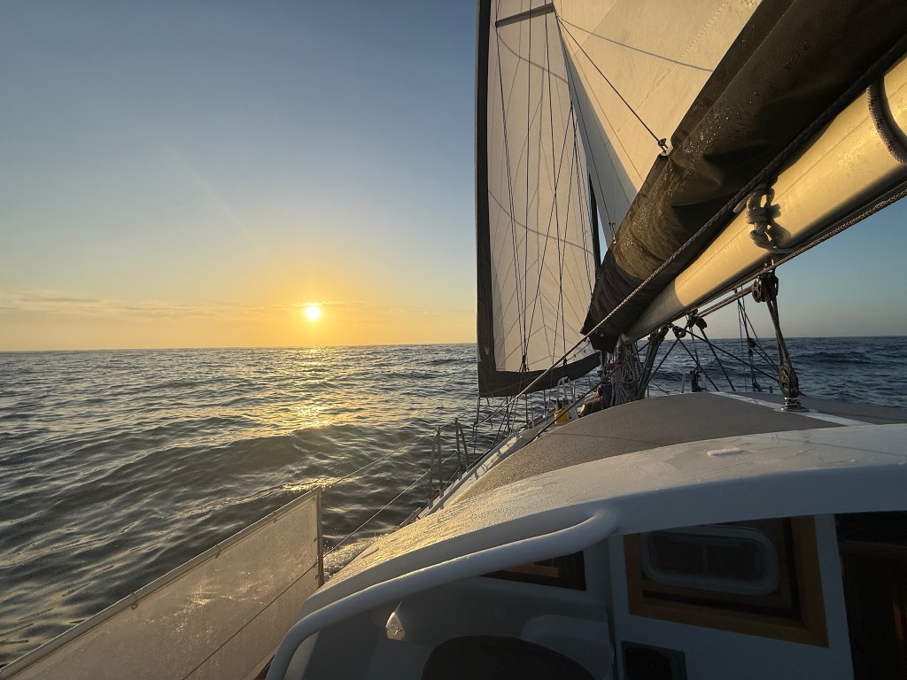 The other good news at this point was that there was still breeze. Before the sun set, we gybed to port and made our way at 8 knots towards Newport, about 100nm to our south east. We kept blasting along that evening but slowly, as forecast, the breeze started to die.